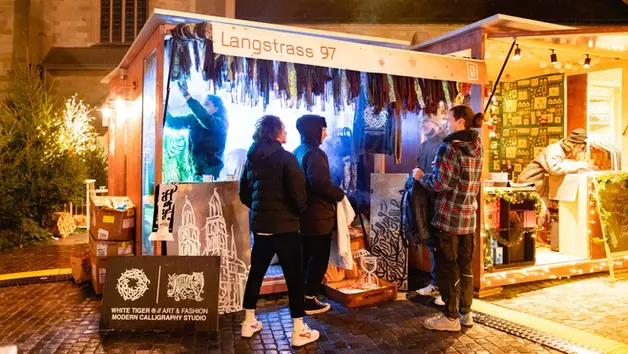 Langstrass 97 (LS97), a Zurich-based party label, collaborated with White Tiger Calligraphy on a unique Christmas project for the 2021 Münsterhof Christmas Market. The goal was to merge LS97’s nightlife energy with handcrafted calligraphy art in a festive public setting.